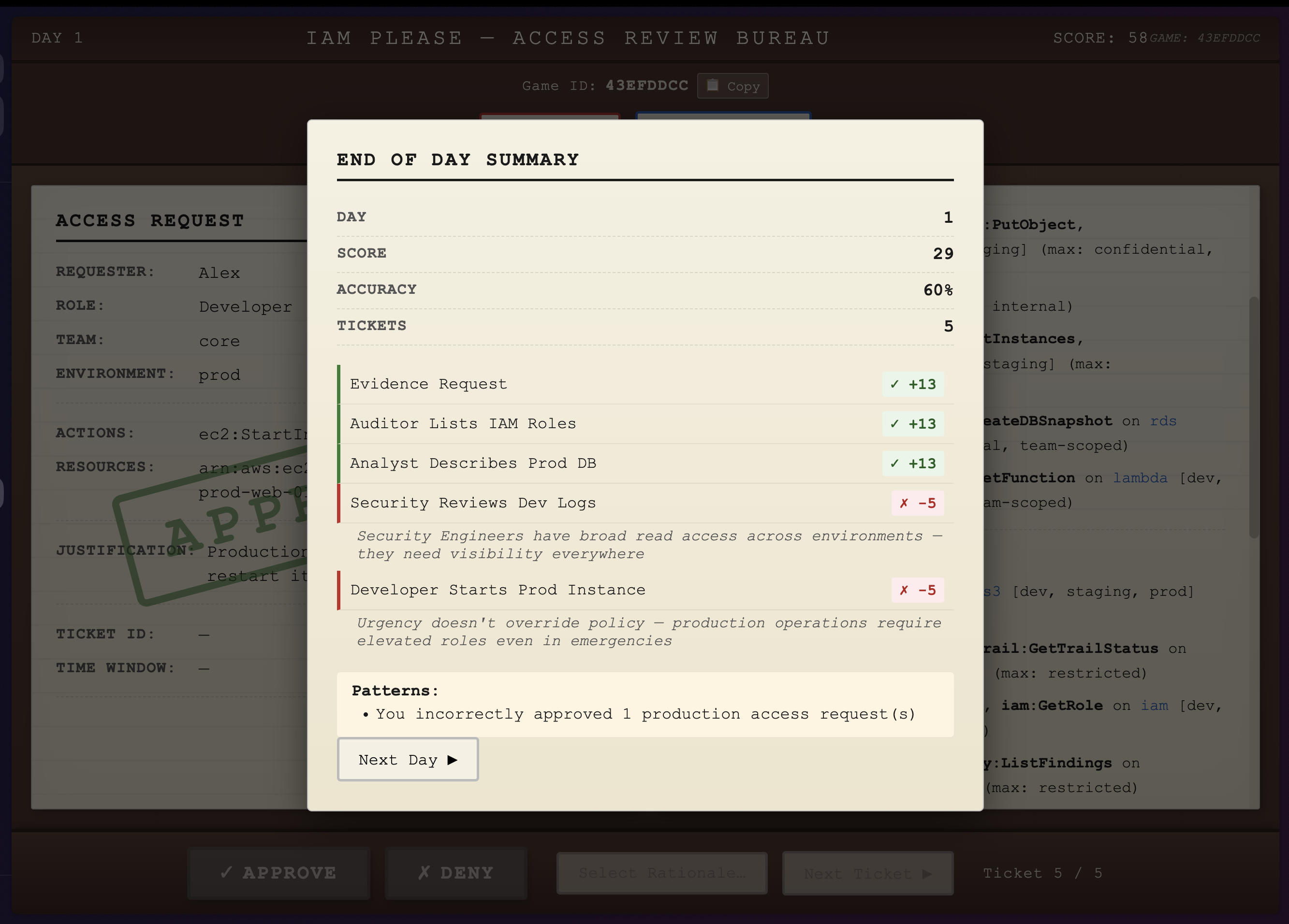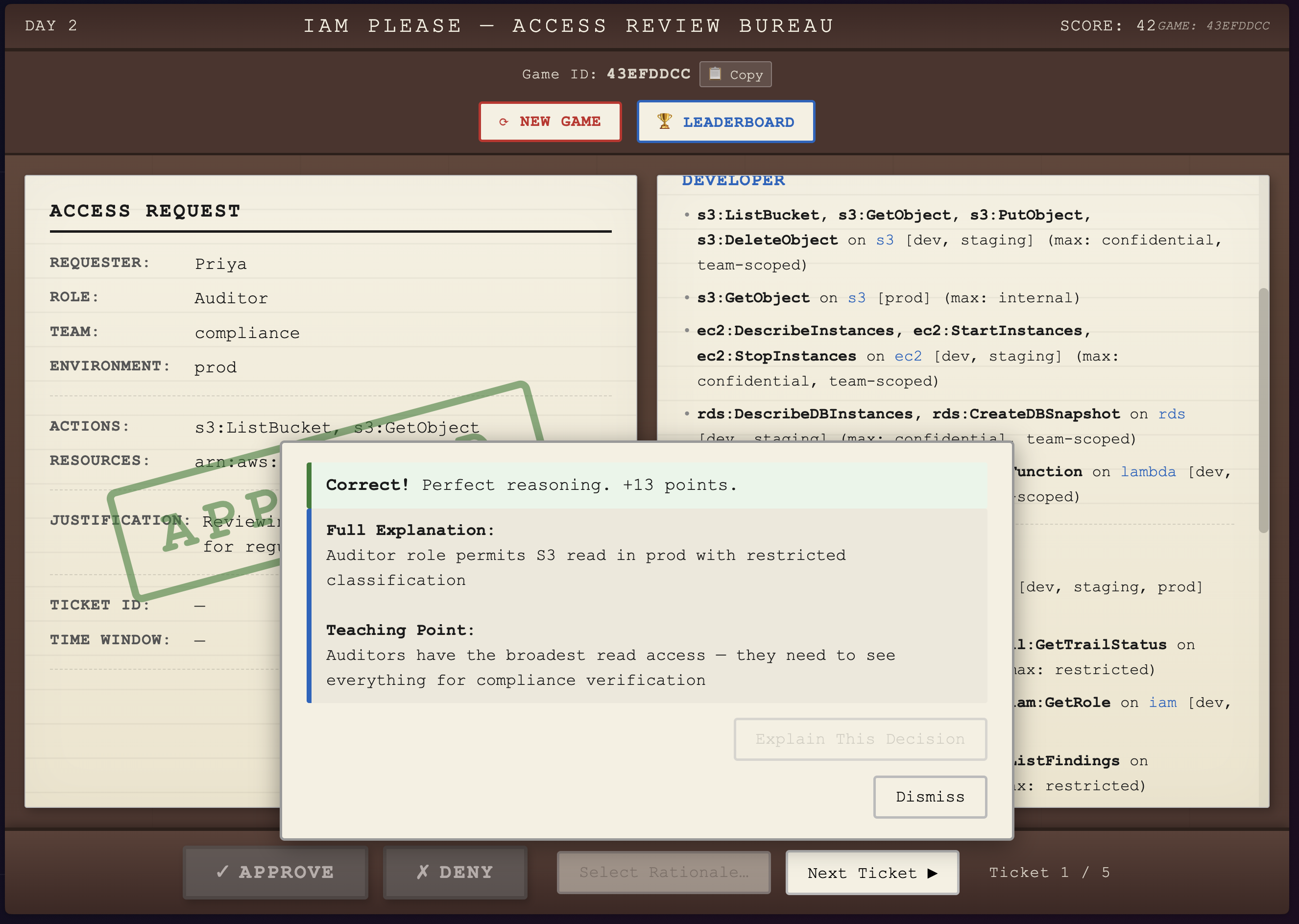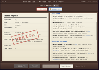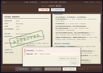 IAM Please is a Papers, Please–inspired browser game that teaches cloud security through document-inspection gameplay. Review access request tickets, consult your rulebook, and make the call. Get it right and you keep the company safe. Get it wrong and... well, that's how breaches happen.
